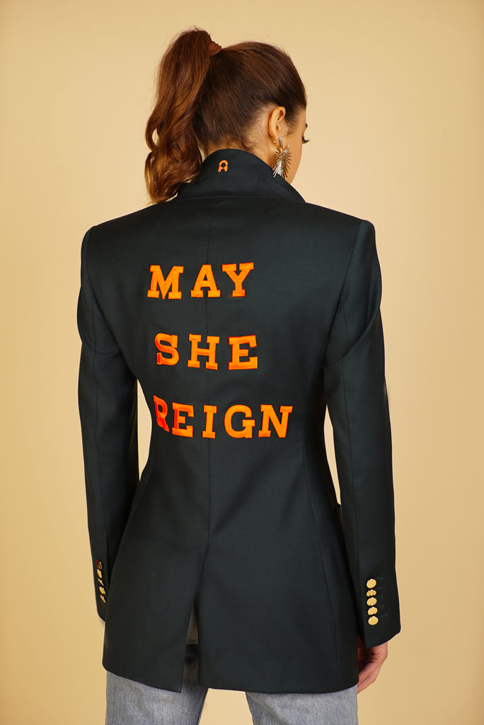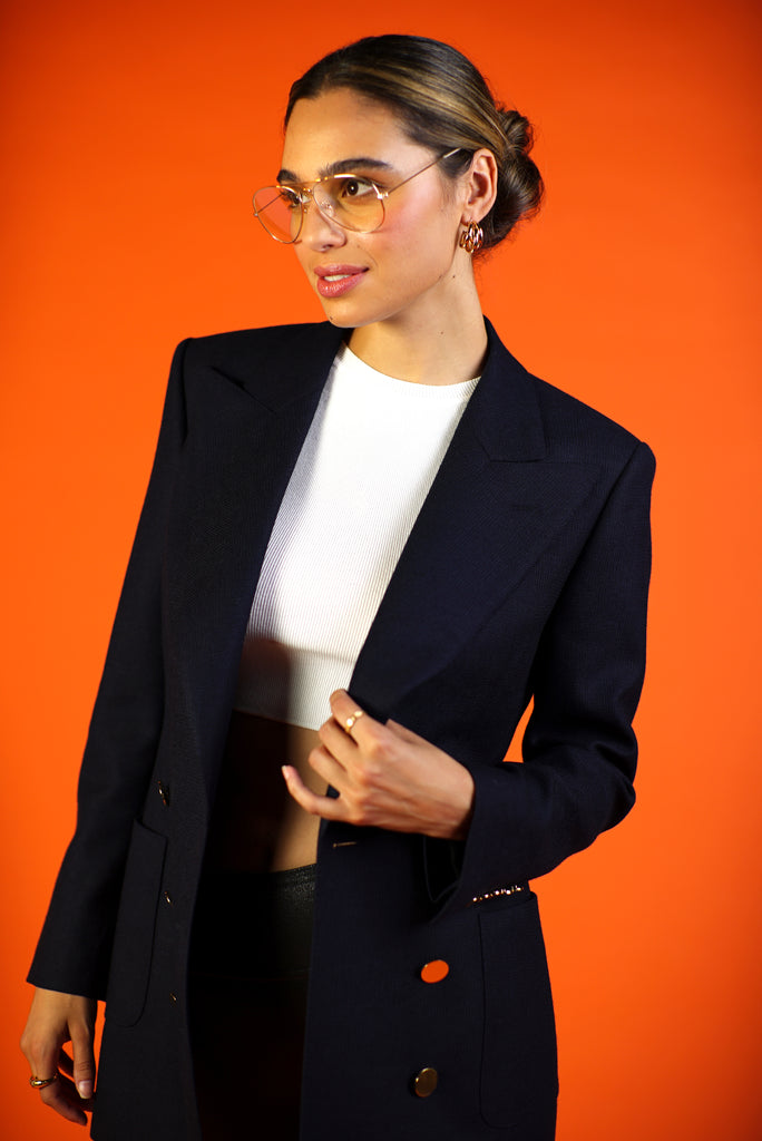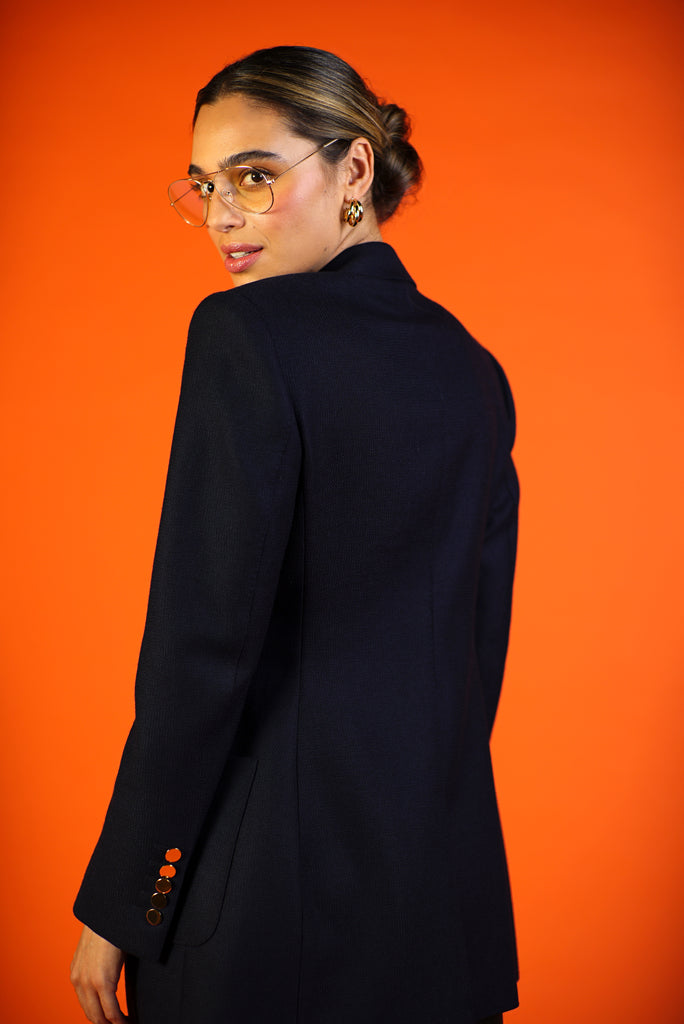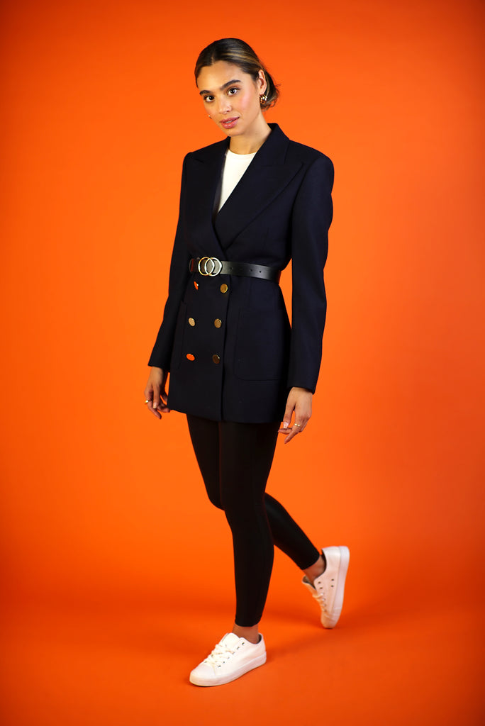 Her shoulder is strong, lapel oversized and silhouette longer. She’s defined in the waist to fit a woman's body–no boxy blazers here. She is made to fit oversized so you can select your usual size or size up for a mid-season lightweight coat style blazer.