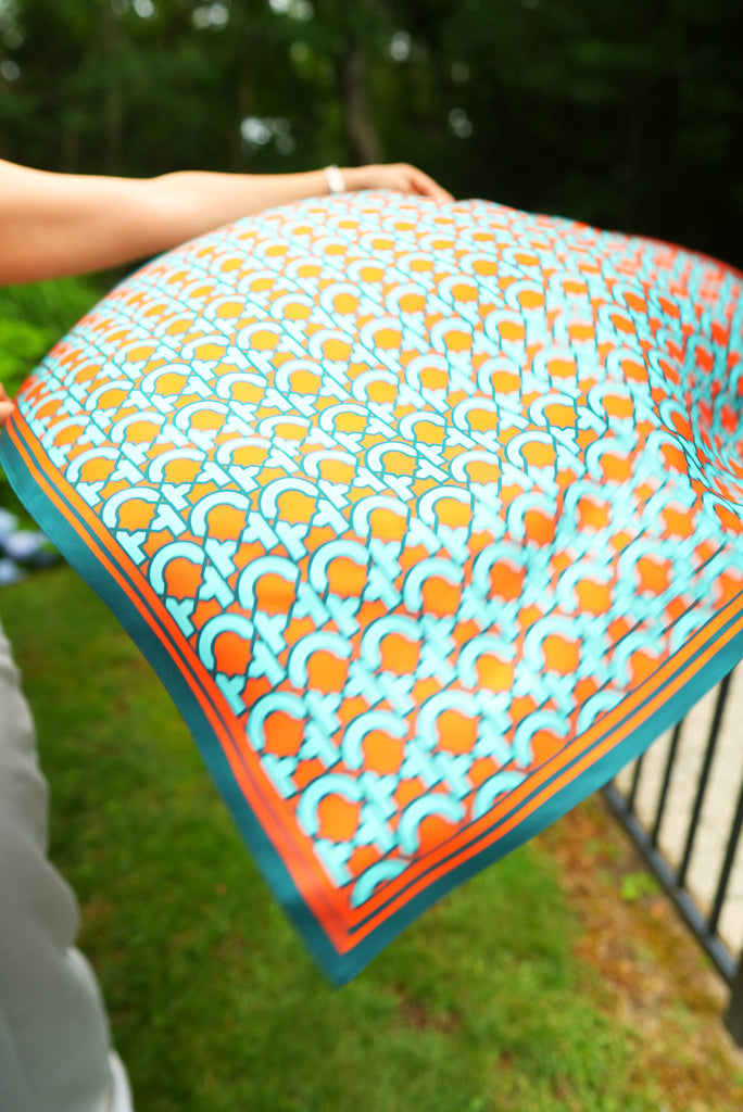 Wear our DALYA icon in our all-over print scarf, now available in a limited edition colorway inspired by the turquoise waters of the Mediterranean and our signature DALYA orange.
