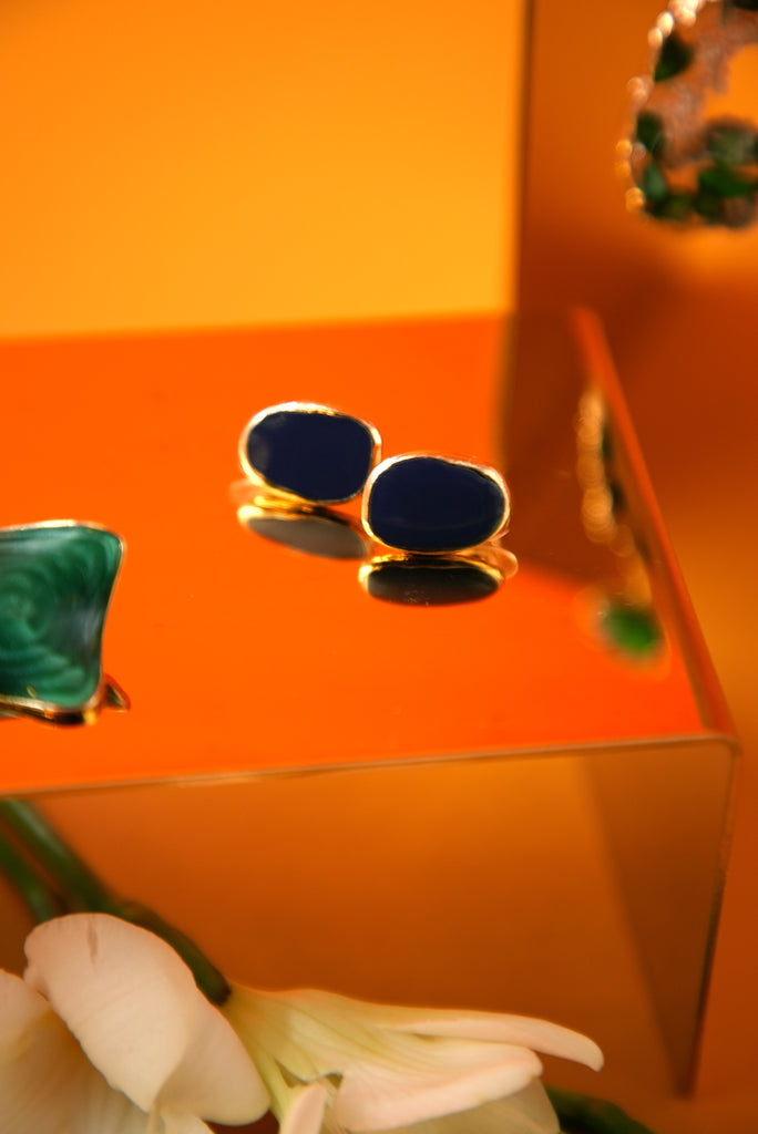 An elegant midnight navy and gold plated design make these stud earrings perfect for any evening look. The subtle color adds charm while the gold base adds shine and interest. Pair with our Evening Collection blazers.