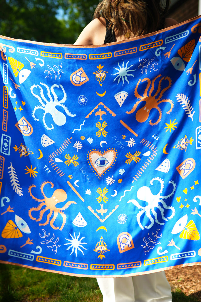 Inspired by the enchanting North Coast of Egypt "Sahel", and the crystal-clear waters of the Mediterranean, this scarf is a tribute to the region’s vibrant heritage. Adorned with intricate motifs including the protective evil eye, a graceful octopus, undulating waves, and refreshing watermelon, all interwoven with the iconic DALYA "A" in a Grecian and ancient Egyptian style, the scarf embodies a rich tapestry of history and natural splendor. Its deep, Mediterranean blue hue evokes the tranquil essence of coastal escapes.